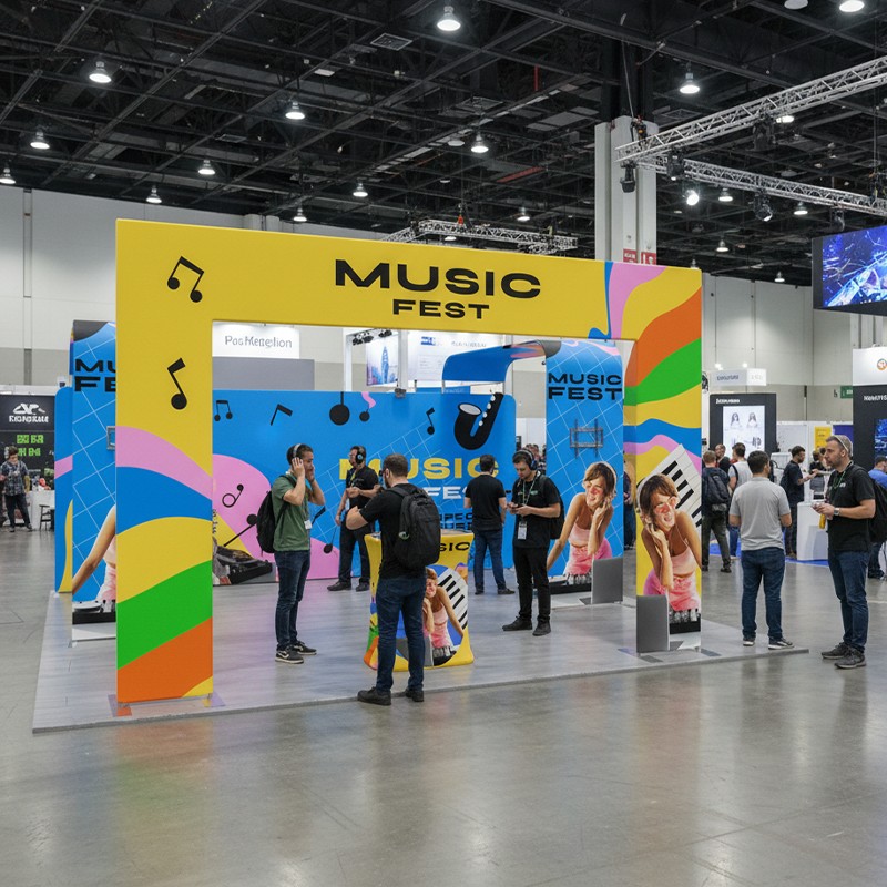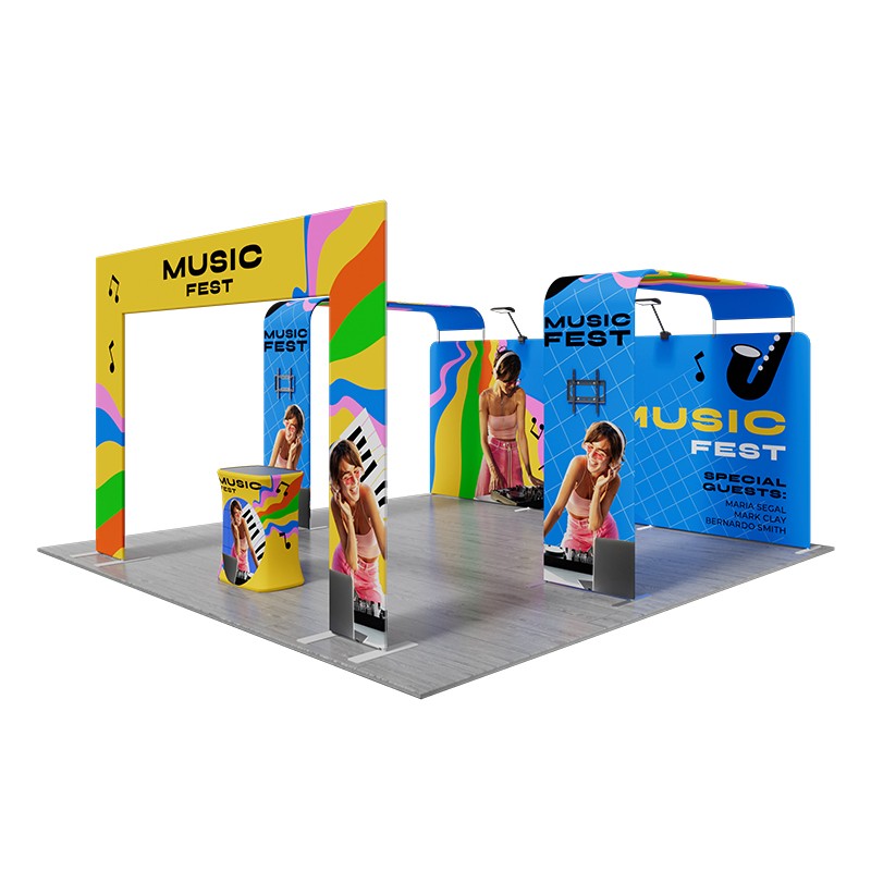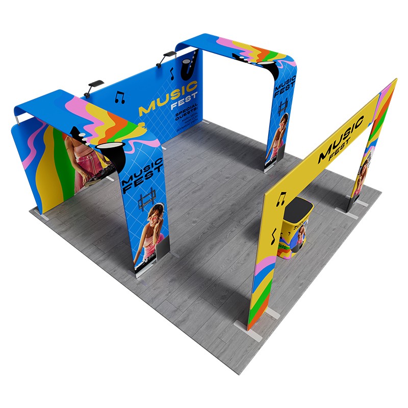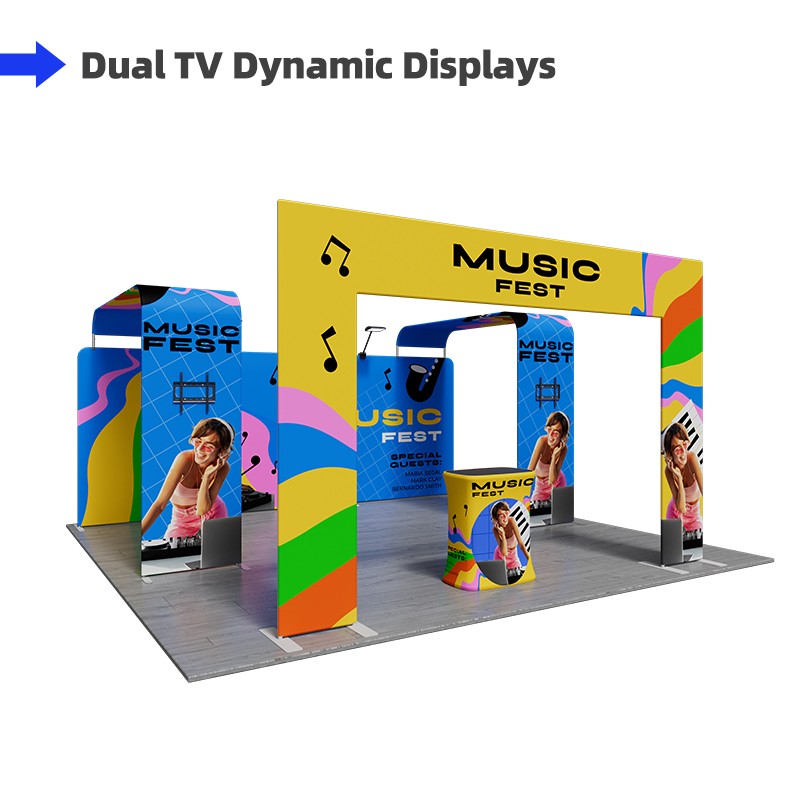 The undeniable focal point of this system is the flat square door arch stand, a massive architectural element that draws visitors in, defining the entrance to your booth space. And the 20ft straight tension fabric display, forming an ultra-large backdrop for high-resolution brand messaging. Enhancing this display are two integrated L shaped displays, each equipped with a dedicated tv rack. This dual-screen setup supports multimedia devices, boosting dynamic visual communication and attendee attraction. Two powerful 40w led lights are included to professionally illuminate the entire display area. Finally, the square counter provides a central hub for immediate guest reception, conversation, or product demonstration.