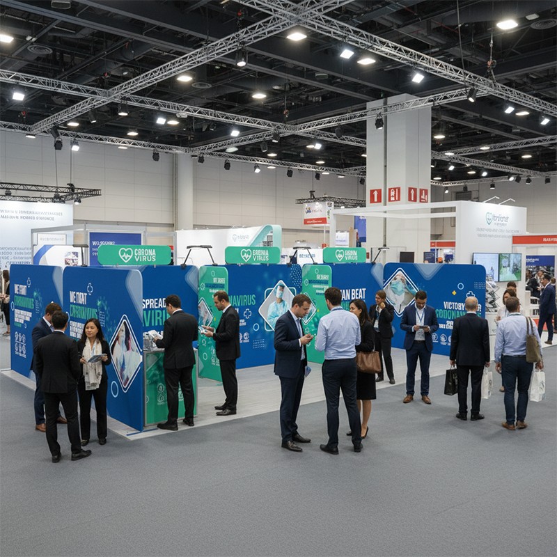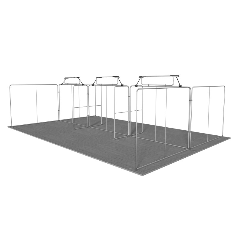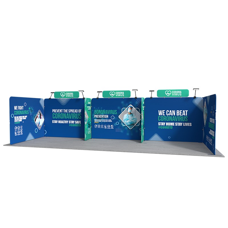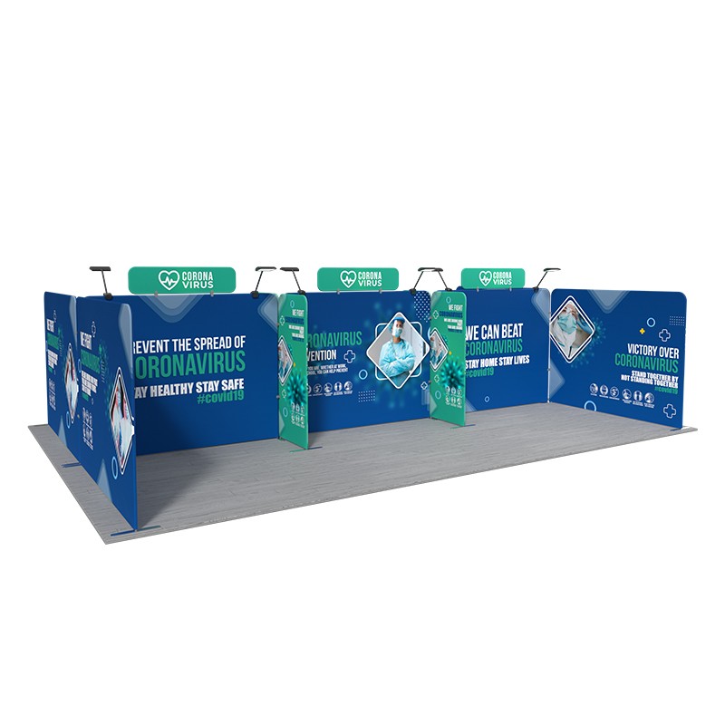 By strategically arranging the 7 large tension fabric displays, 4 fabric banner stand for partition, 6 powerful 40W LED lights for optimal illumination, and 2 rectangular tension fabric headers to draw attention to key areas, this configuration excels as a portable room divider or privacy screen. The layout is crucial for applications like biometric or health screenings, patient consultations, or providing a private retreat in shared travel or business spaces.The large displays feature high-quality dye sublimation graphics, ensuring a seamless, wrinkle-free, and professional appearance. The lightweight yet sturdy aluminum frames are designed for tool-free assembly and rapid dismantling, making them ideal for traveling professionals and repeated use. The system’s portability makes it perfect for temporary setups in hospitals, doctor’s offices, patient overflow rooms, or even providing privacy in the home.